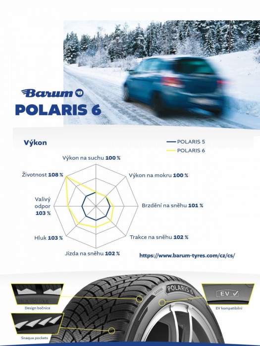 Zimnú pneumatiku Barum Polaris 6 charakterizuje mierne športový vzhľad, vykazujúci niektoré znaky prémiovej triedy. Prechod zo smerového na šípový dezén sa odráža v zlepšení jazdy na snehu a 3D lamely sa podieľajú na podpore trakcie na snehu. Predĺžený kilometrový výkon pneumatiky Barum Polaris 6 zabezpečí nová gumová zmes, ktorá má na svedomí aj väčšie zaťaženie pneumatiky, vďaka čomu je menší uhol skosenia bočných hrán.