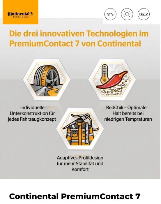Continental PremiumContact 7 predstavuje modernú letnú pneumatiku navrhnutú pre bezpečný a komfortný výkon. Dezén je optimalizovaný pre rôzne jazdné podmienky a reflektuje požiadavky moderných vozidiel vrátane elektromobilov.