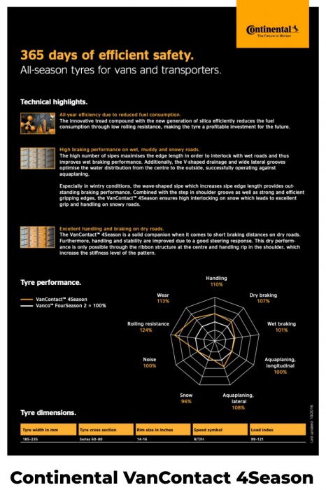VanContact 4Season je konštruovaná tak, aby zvládla vysoké zaťaženie, časté rozjazdy a mestskú prevádzku. Zosilnené bočnice zvyšujú stabilitu pri naloženej dodávke.