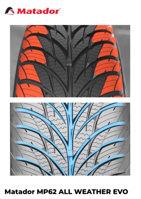 Matador MP62 All Weather Evo je moderná celoročná pneumatika vyvinutá pre vodičov, ktorí chcú jazdiť celý rok bez potreby prezúvania. Vďaka technológiám koncernu Continental kombinuje spoľahlivý výkon na mokrej vozovke, istotu na snehu a stabilitu v letných teplotách. MP62 je ideálne riešenie pre mestské a prímestské jazdenie, kde sa často striedajú rôzne podmienky.