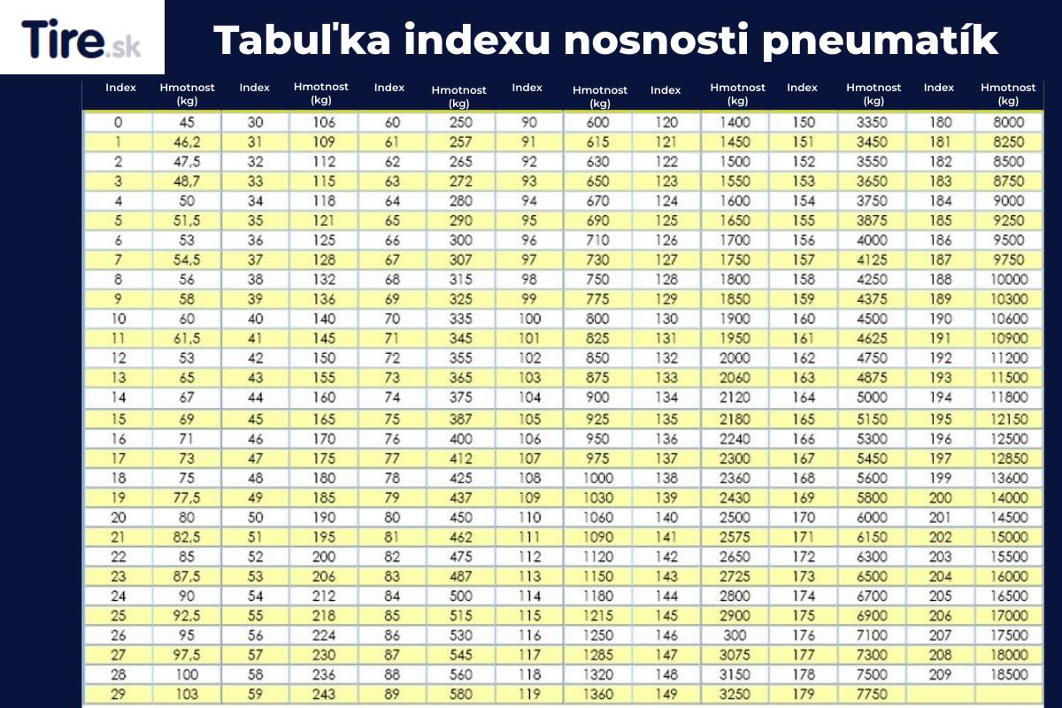 Nasledujúca tabuľka slúži ako nevyhnutný nástroj na preklad číselného indexu nosnosti, ktorý nájdete na bočnici pneumatiky a v technickom preukaze vozidla, na skutočnú maximálnu hmotnosť v kilogramoch, ktorú môže jedna pneumatika uniesť.